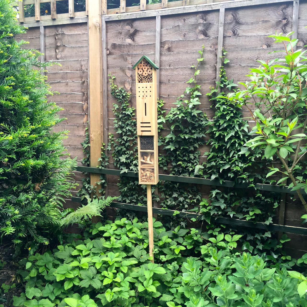 I carried this insect house around Grand Designs earlier this year, and finally it has been installed amongst the wild strawberries, which have come through the fence from yet another neighbour.