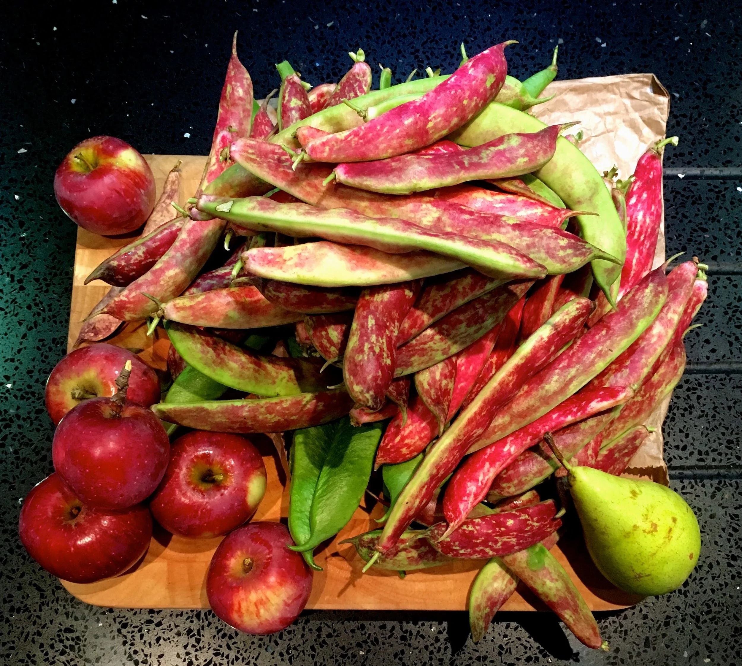 And we've already made good progress on eating these. A rhubarb crumble is half-eaten in the fridge, there's plans for apple and pear compote. We've eaten the borlotti beans with some pork loin from the butchers, and the runner beans will no doubt feature on our plates during the week too.