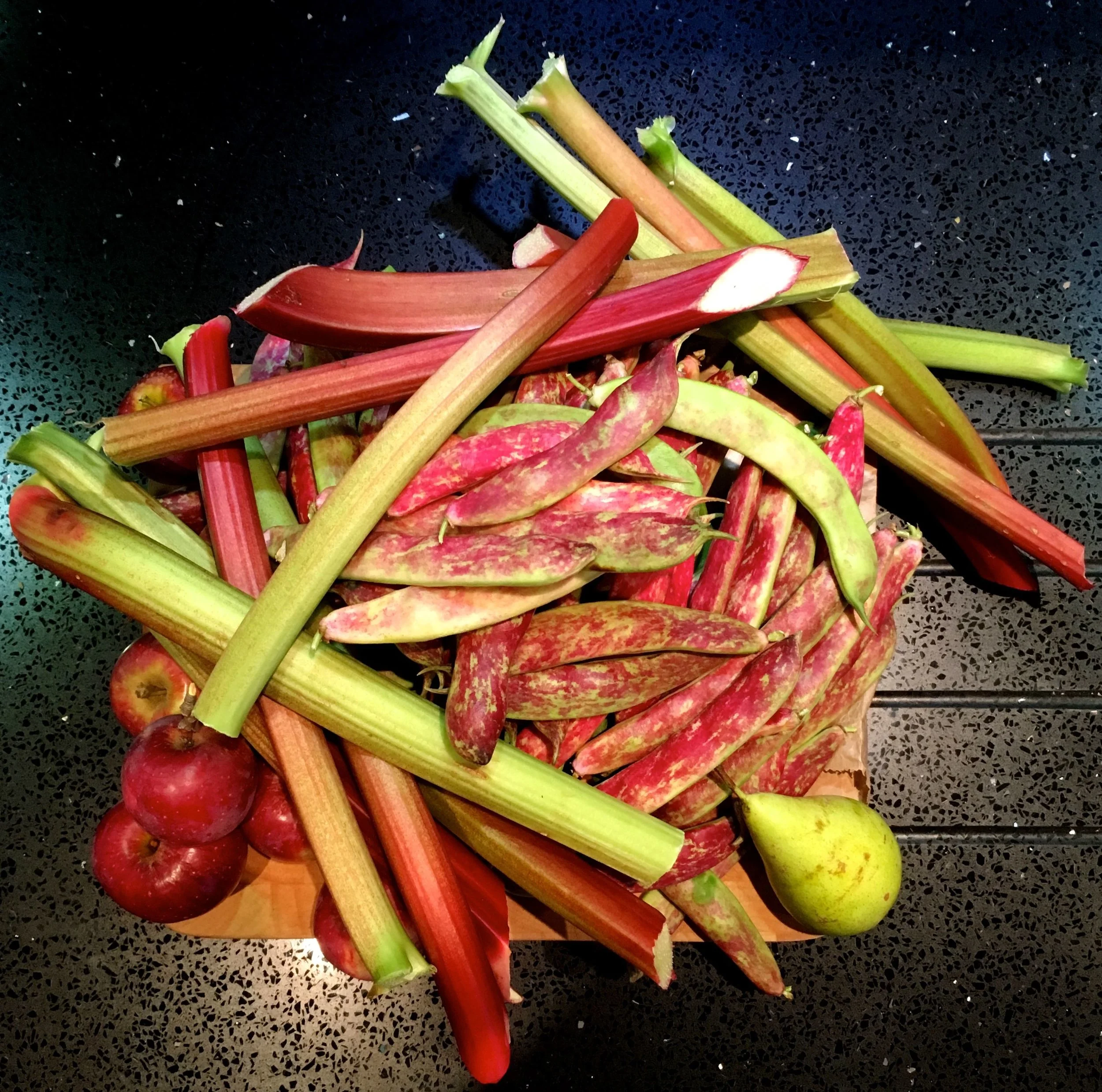 There wasn't much space left on my chopping board, and I'd never thought of rhubarb as being the same colour as borlotti beans before, or apples and pears, but they are.
