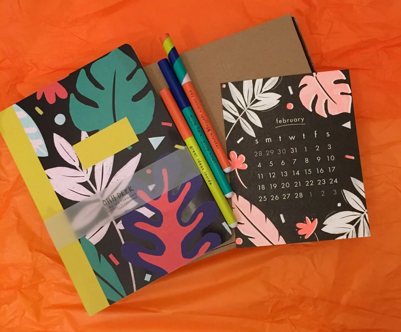 inside the box there was a tropically patterned notebook, a month card (look out for that on Instagram at some point during the month, I'm sure), and some slogan pens all brightly coloured and wrapped in zingy tissue paper.