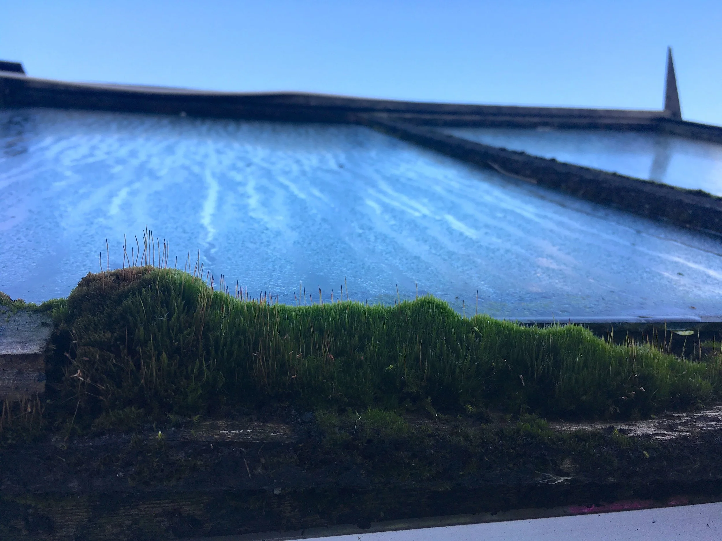 Moss and dew on the greenhouse