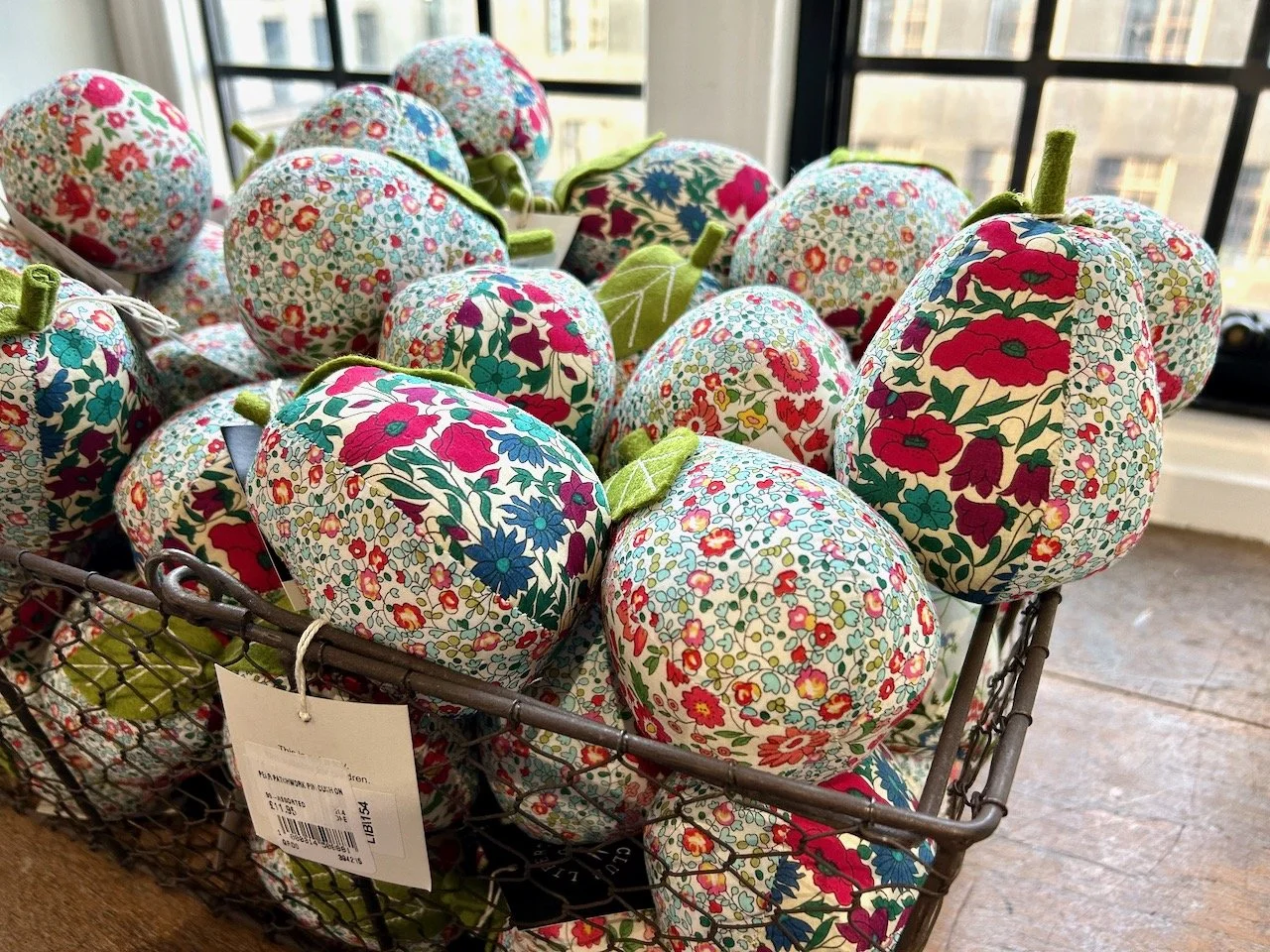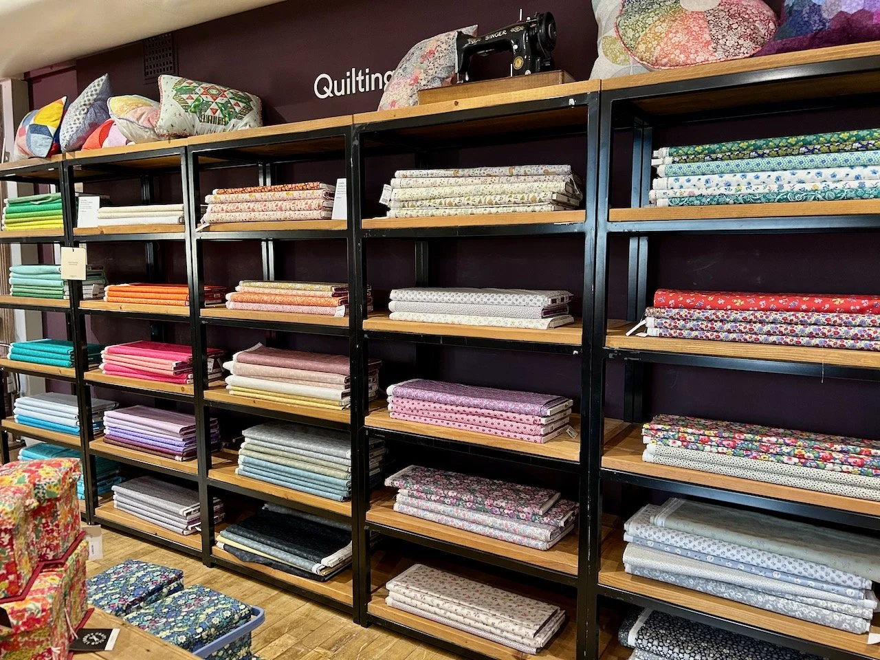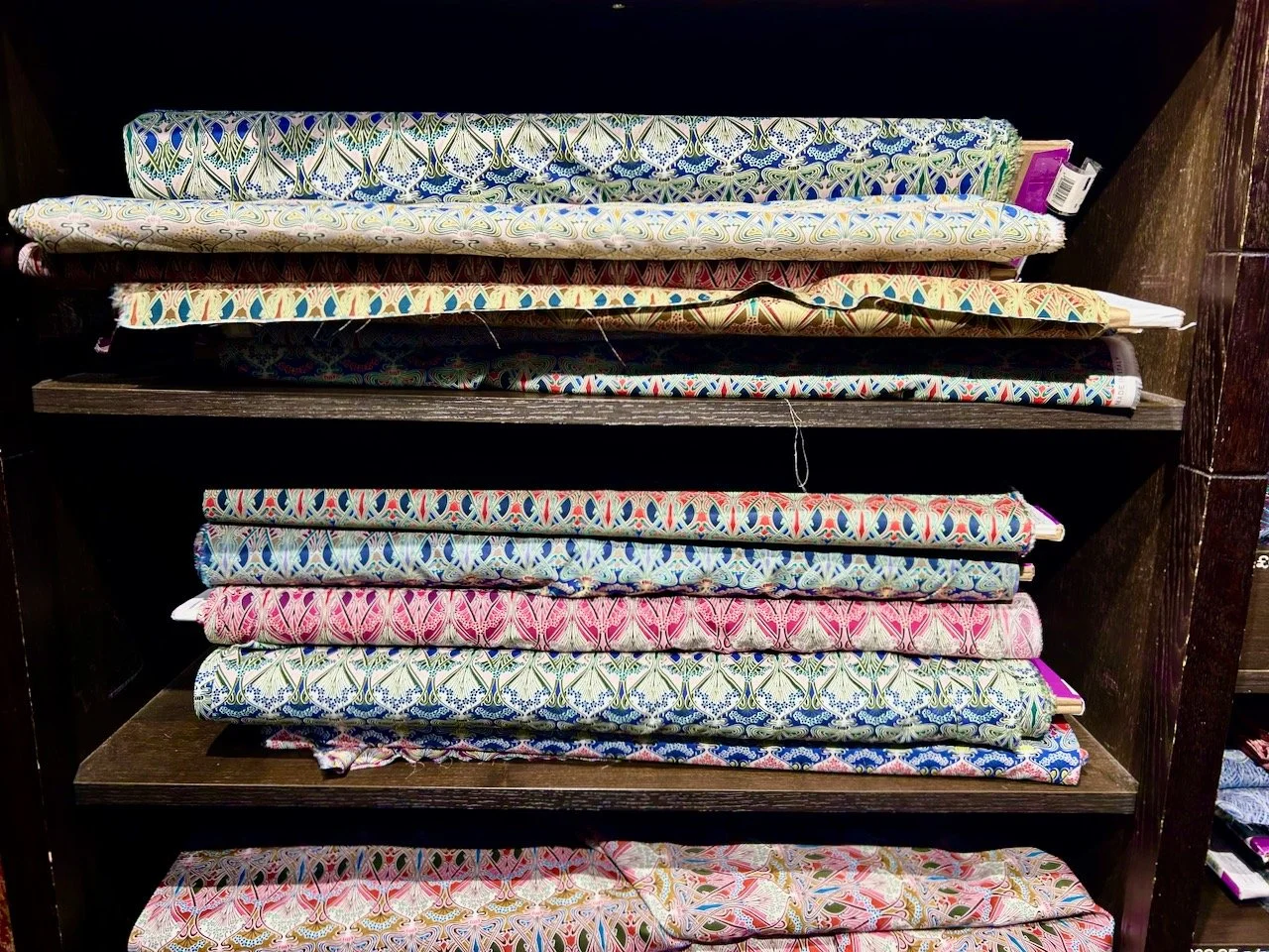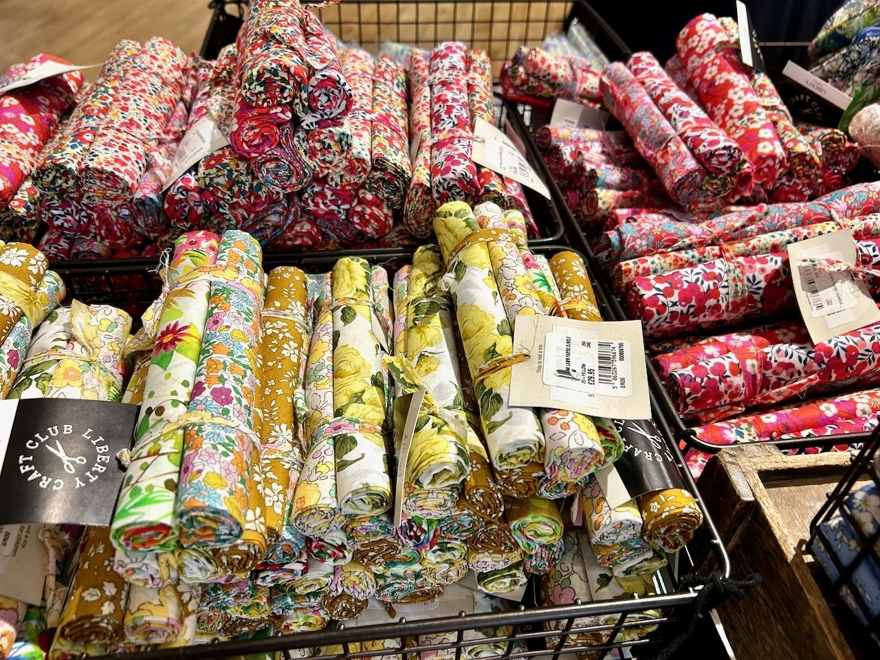 The haberdashery was laden with baskets of tempting Liberty fabric - some already made into pincushions, and others into equally pretty rolls and bundles. I was tempted, but out of the corner of my eye I saw the wall of quilting fabric and I had a new destination in mind.