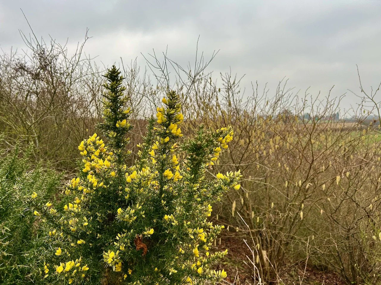We set off early afternoon, when we were hoping that the temperatures would be at their highest - and after a round of watching Six Nations matches on the TV and ahead of watching Liverpool in the FA Cup, it was good to get out and stretch our legs. We opted for a road-based walked, heading once again down Moor Lane. Our choice was rewarded by the flowering gorse as we followed the road as it rose up over the A46.