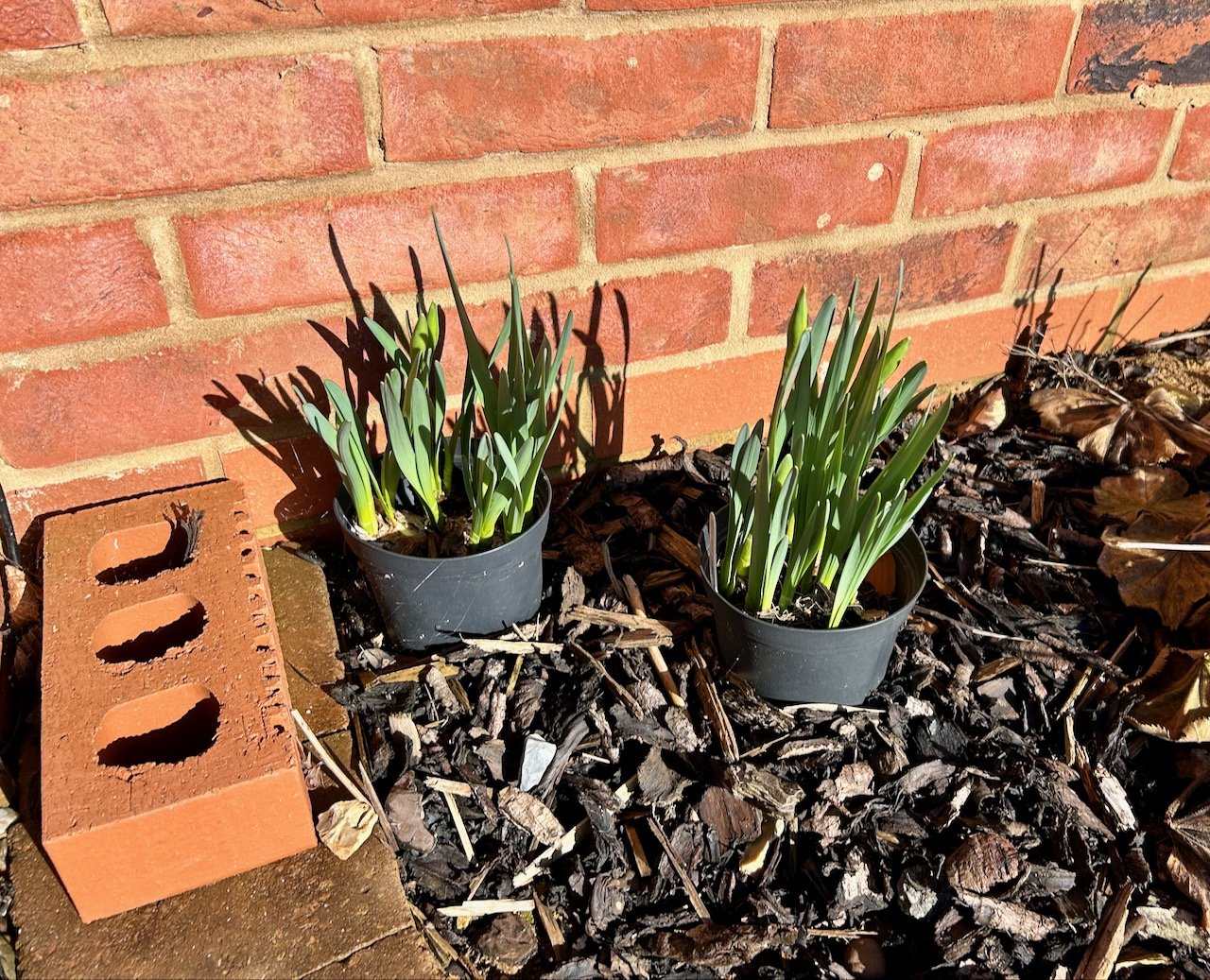 I don’t yet have flowering daffodils, and it is still quite early for them, but I think these two pots by the gate are the likeliest to flower first, and I can’t wait.