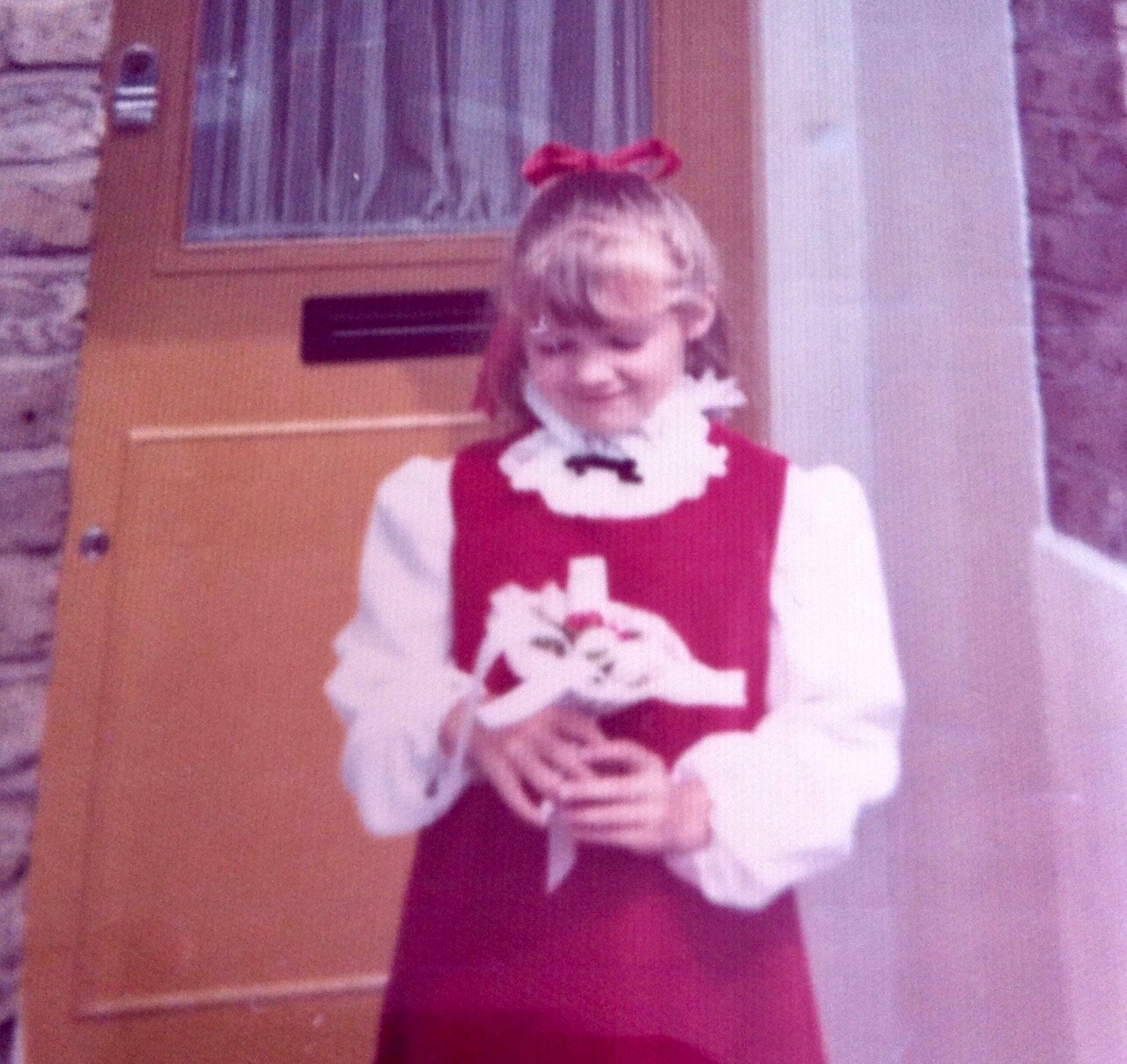 That prompted a flurry of memories for, not only me, but mum and dad and my brother too. I looked through my photos of photos from mum and dad’s photo albums, but could only find this one of me outside the front door. Clearly before photos in your school uniform became the norm. Here I’m in my bridesmaid outfit for my aunt’s wedding, in Bristol. No idea why, but it must have been after the actual wedding as I have my bouquet, and that red pinafore was floor length and red velvet. I told you it was the 1970s.