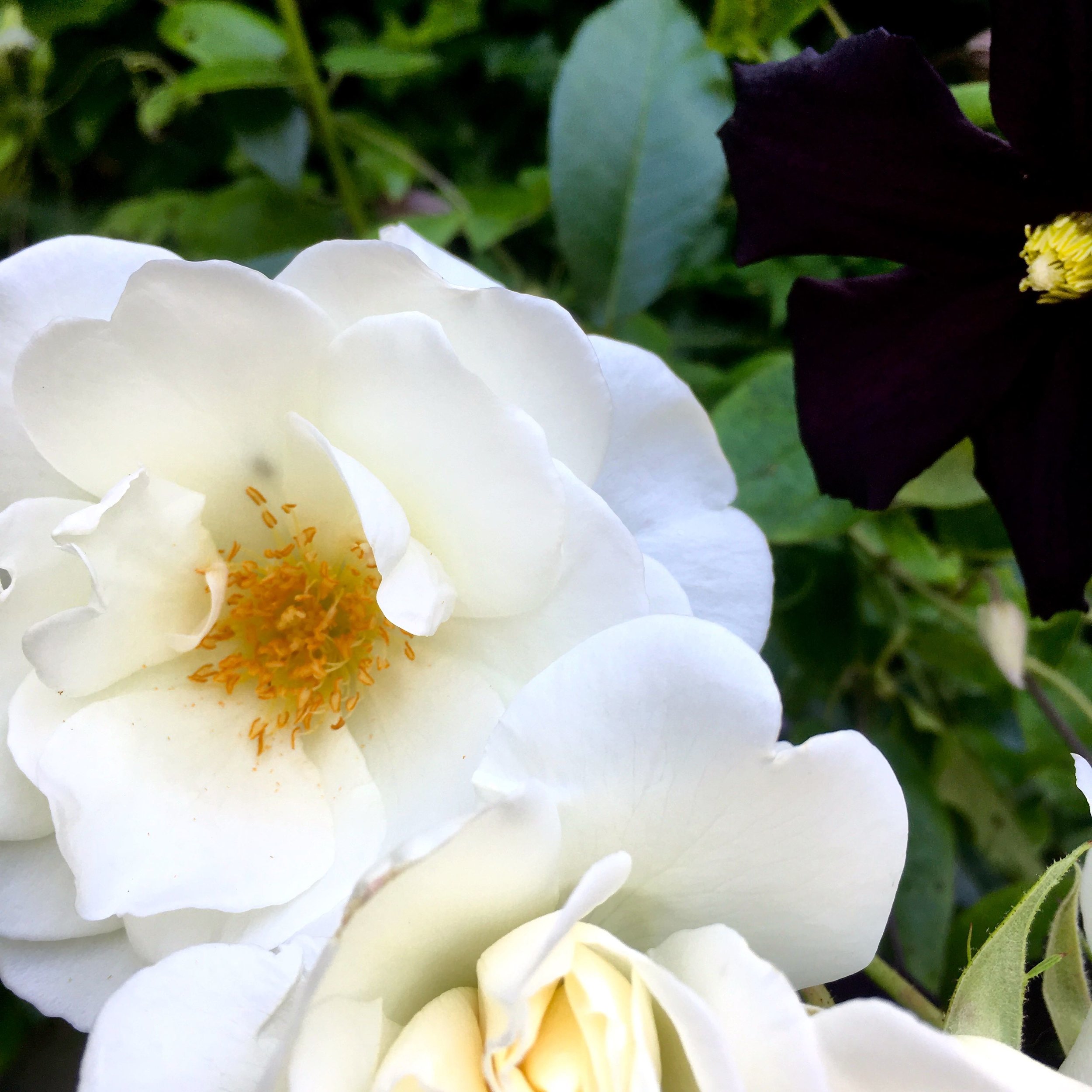 As well as the scent of jasmine and honeysuckle on the patio, we've been surrounded by roses and clematis, which I've realised are the opposite of each other with their light and dark petals.