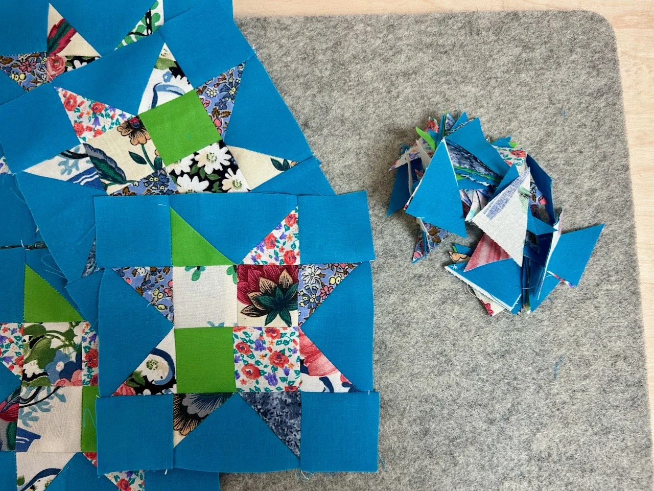 This month I decided to embrace the pinks and everything floral - after a couple of months avoiding pink, it felt good to let the pink roll! The Ohio Star block looked similar but different to one I’d completed earlier in this challenge, and when I looked back it was the friendly bee quilt it reminded me of.