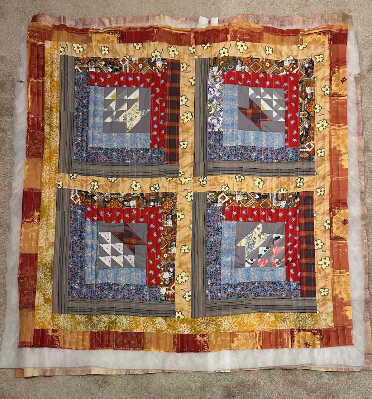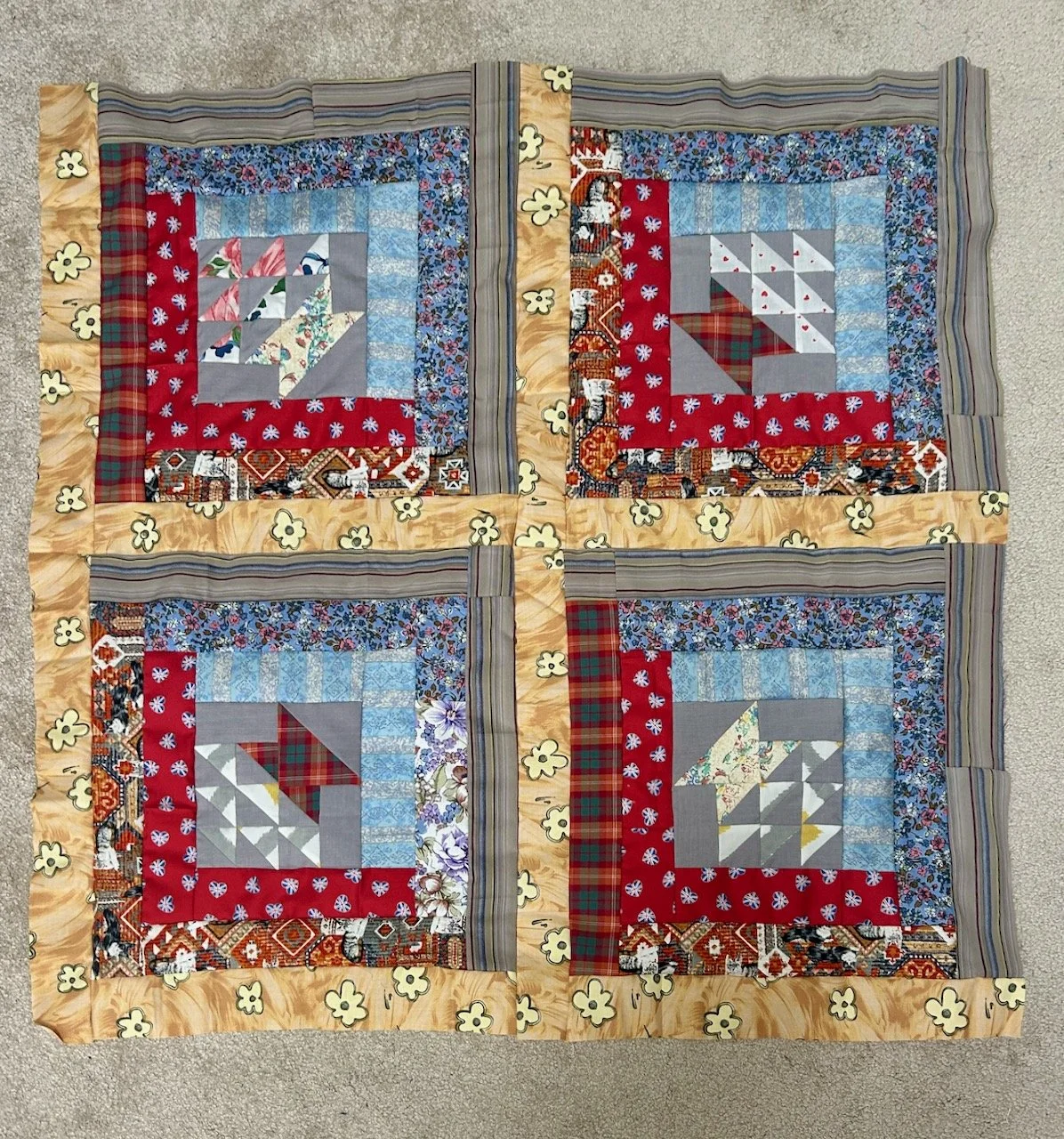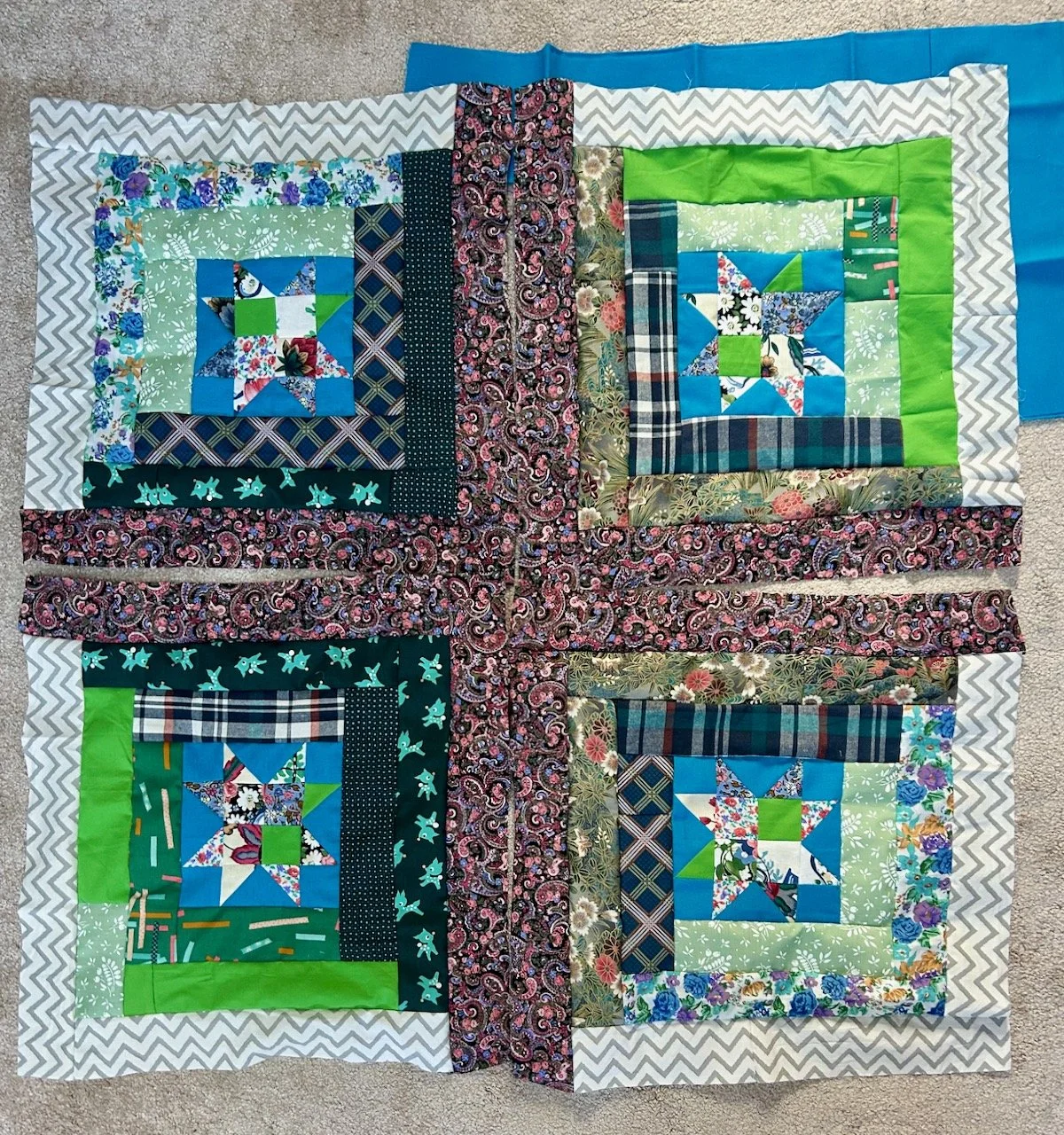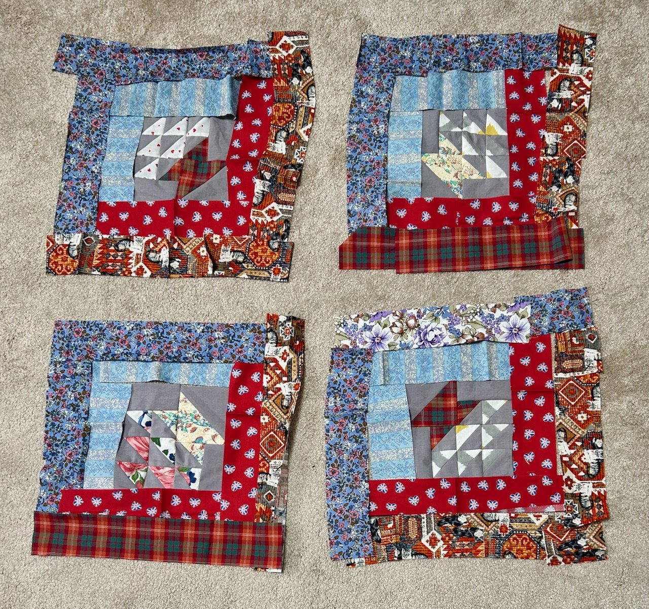 I randomly laid the blocks out after adding the first log cabin border and really liked the position of the darker burgundy fabric, and so that became the layout I was working too, although it meant I needed to make some adjustments when adding a final border so that it remained balanced to the eye.