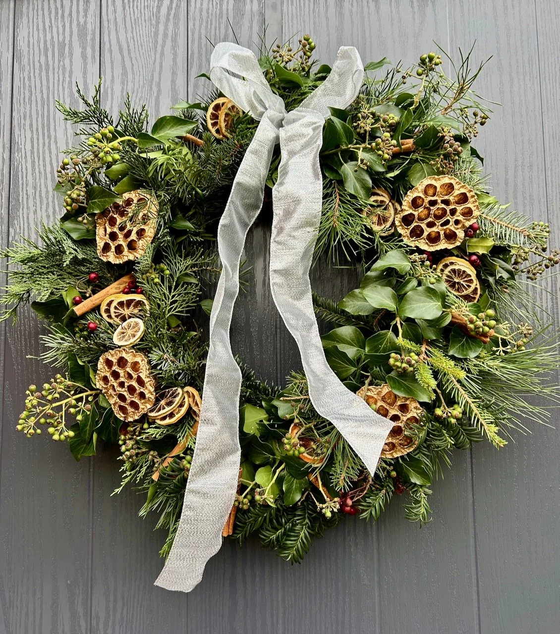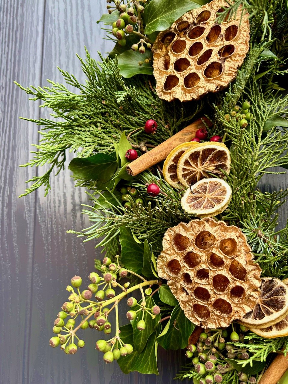 This year instead of decanting the wreath into the garage overnight, I left it in the boot of the car. Retrieving it the next morning brought a pleasant surprise as not only was it the first time I’d seen the wreath in daylight, but the car also smelt of the pine and eucalyptus foliage.