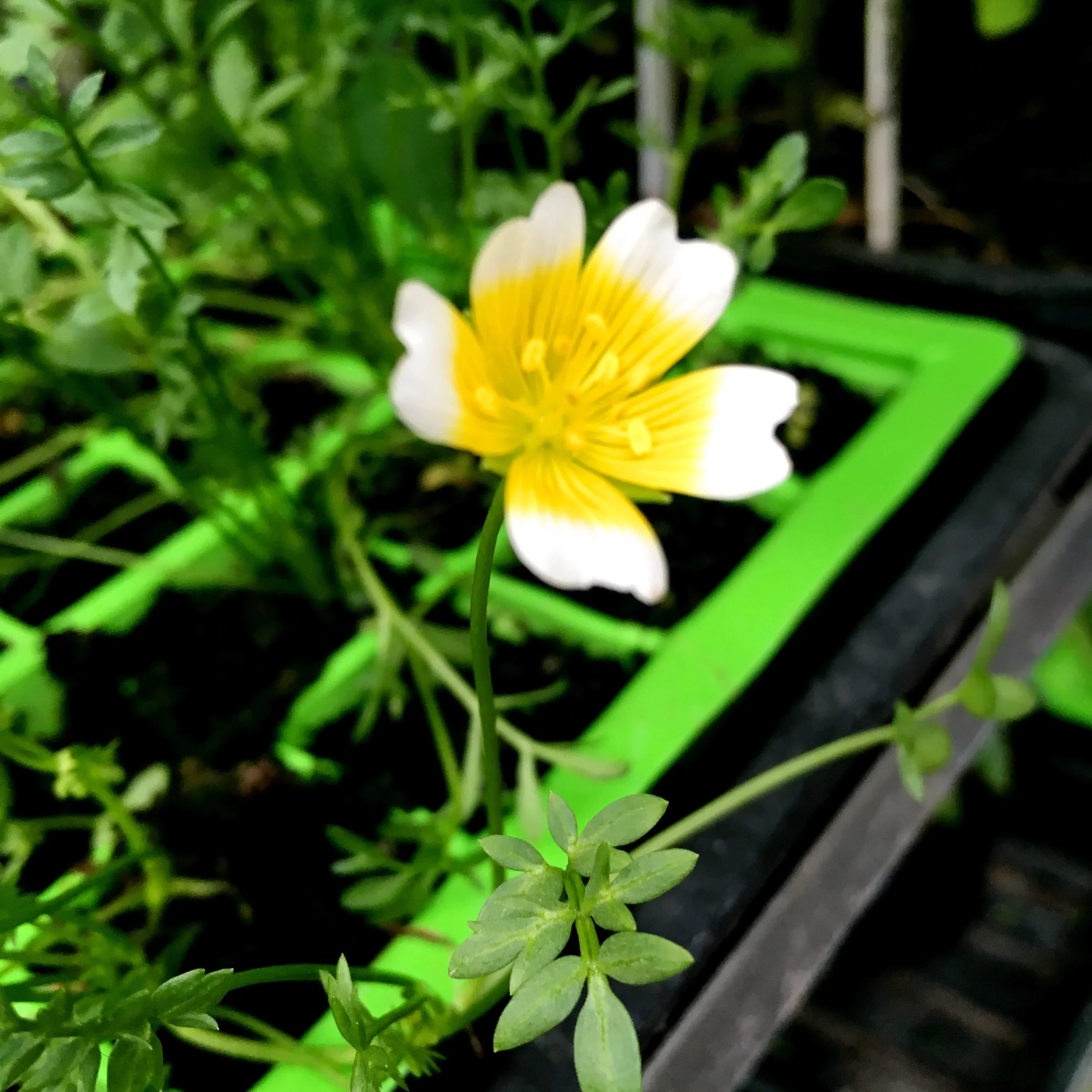 The flowers I have in the greenhouse continue to flower, it seems both those grown from seed and the miniature bedding plants are acting the same way, and both are adding some unusual colour to my space. The one below is a poached egg plant and good for attracting pollinators. Pretty too.