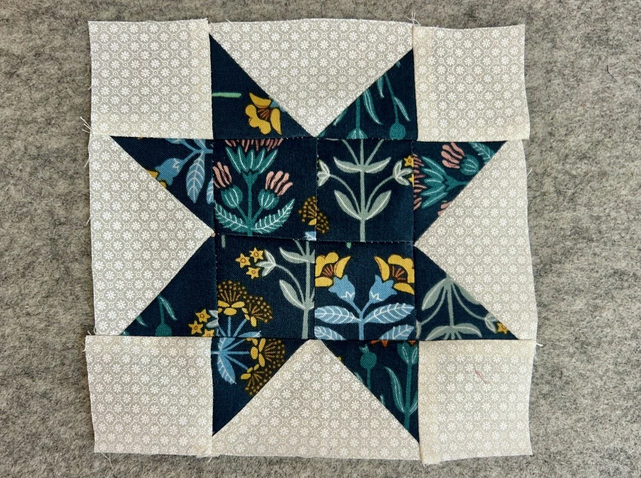 A patchwork star made with the same navy material but looking every bit a patchwork
