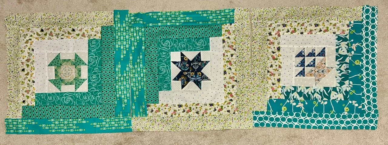 The blocks from this month and the previous two months laid out side by side as a preview for a row in the finished quilt