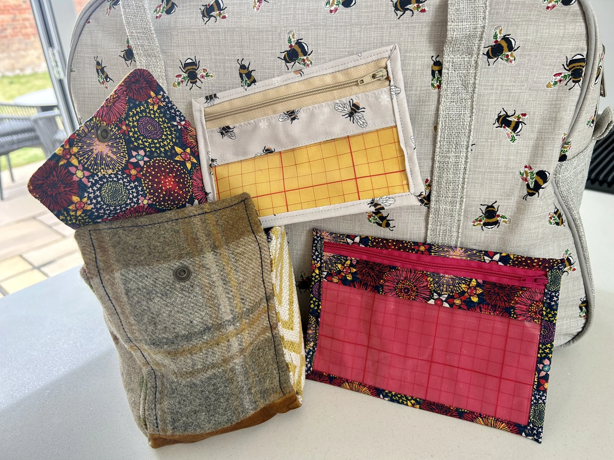 1. The blue pouch (top left), black patterned pouch (bottom left) and gold pouch (bottom right) are recent makes on my new ‘take to’ machine.