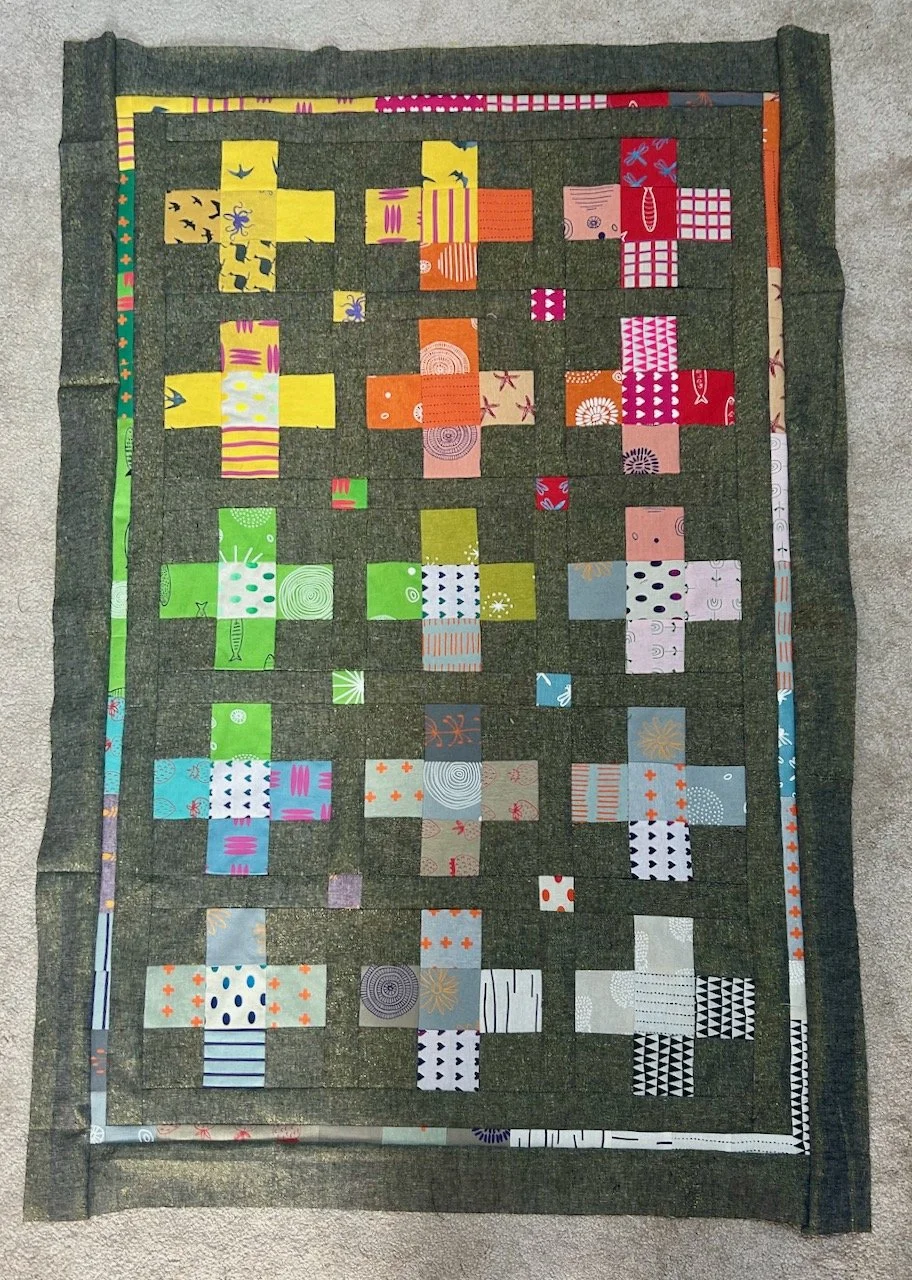 Since my last update I’ve sewn all the blocks together, added sashing in between the blocks with pops of corresponding colour by the crosses. I also decided I wanted to add more borders, and just about had enough material left to add a narrow border following the colour wash across the blanket.