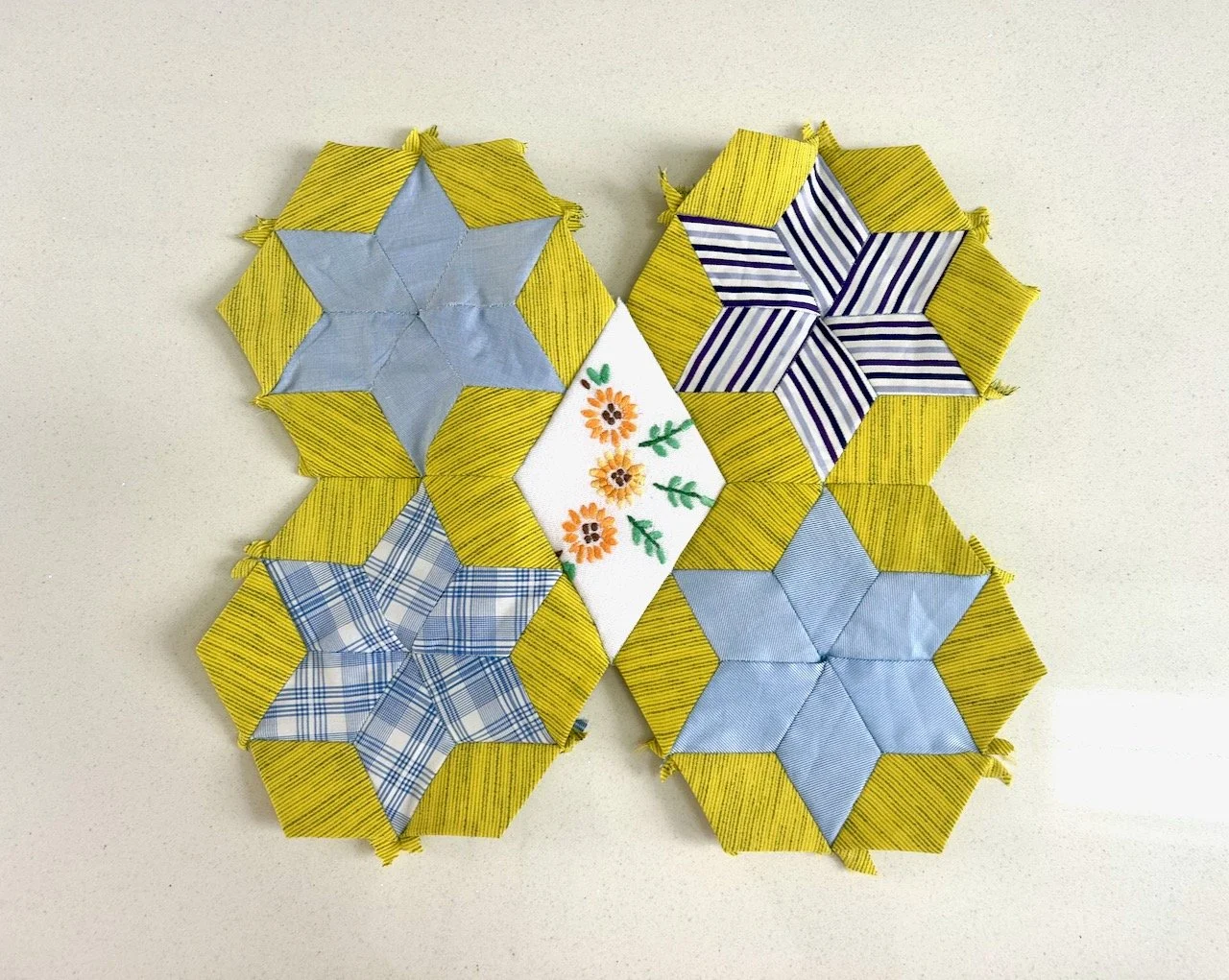But I pressed on as I wanted to free up more of the small diamond templates, as my pile of green and blue blocks are growing more quickly than I have free templates. MOH suggested I just bought some more, but I have them - they’re just covered in fabric, and freeing them gees me along on this project.