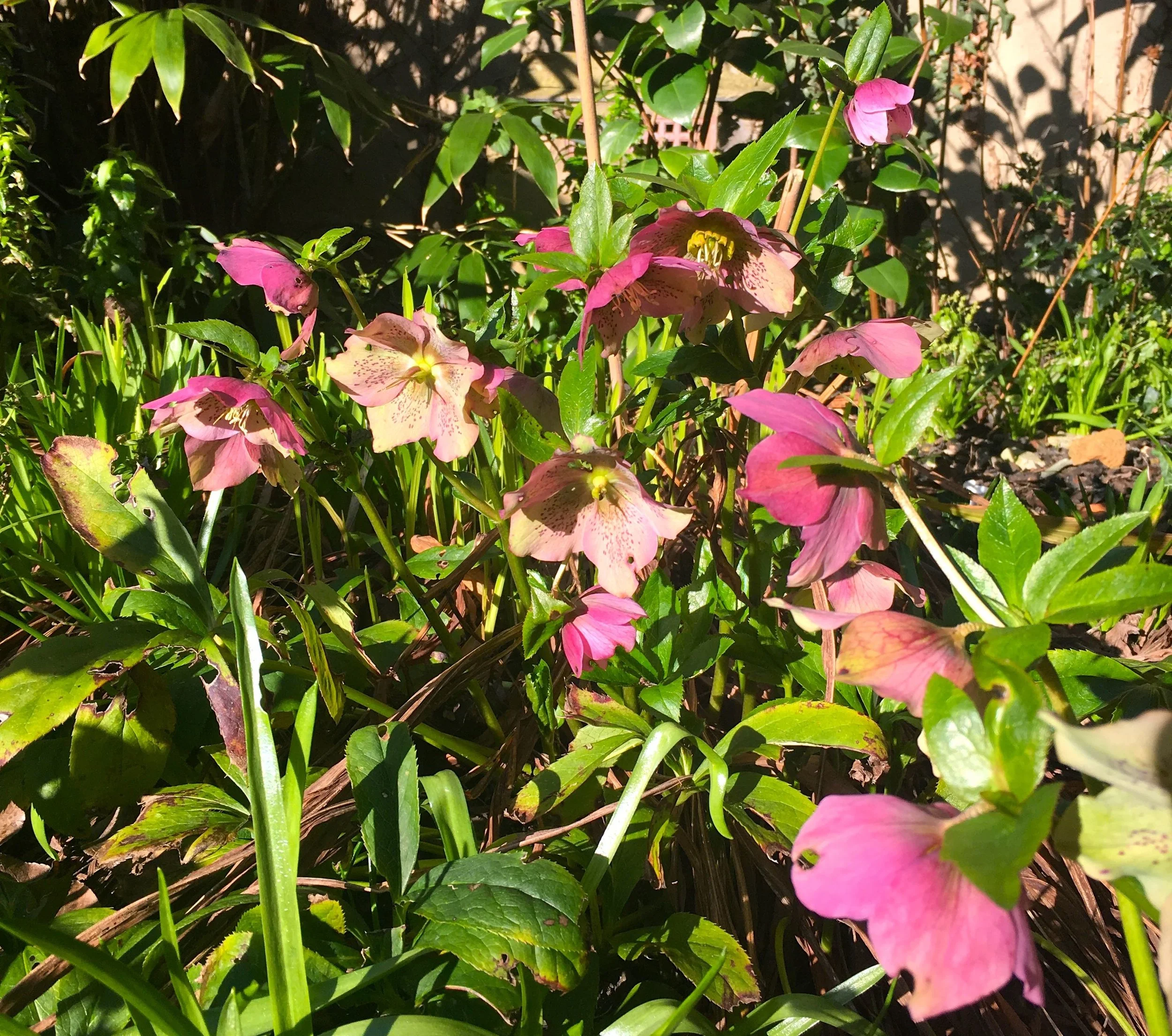 Cheery but shy hellebores on view from the house