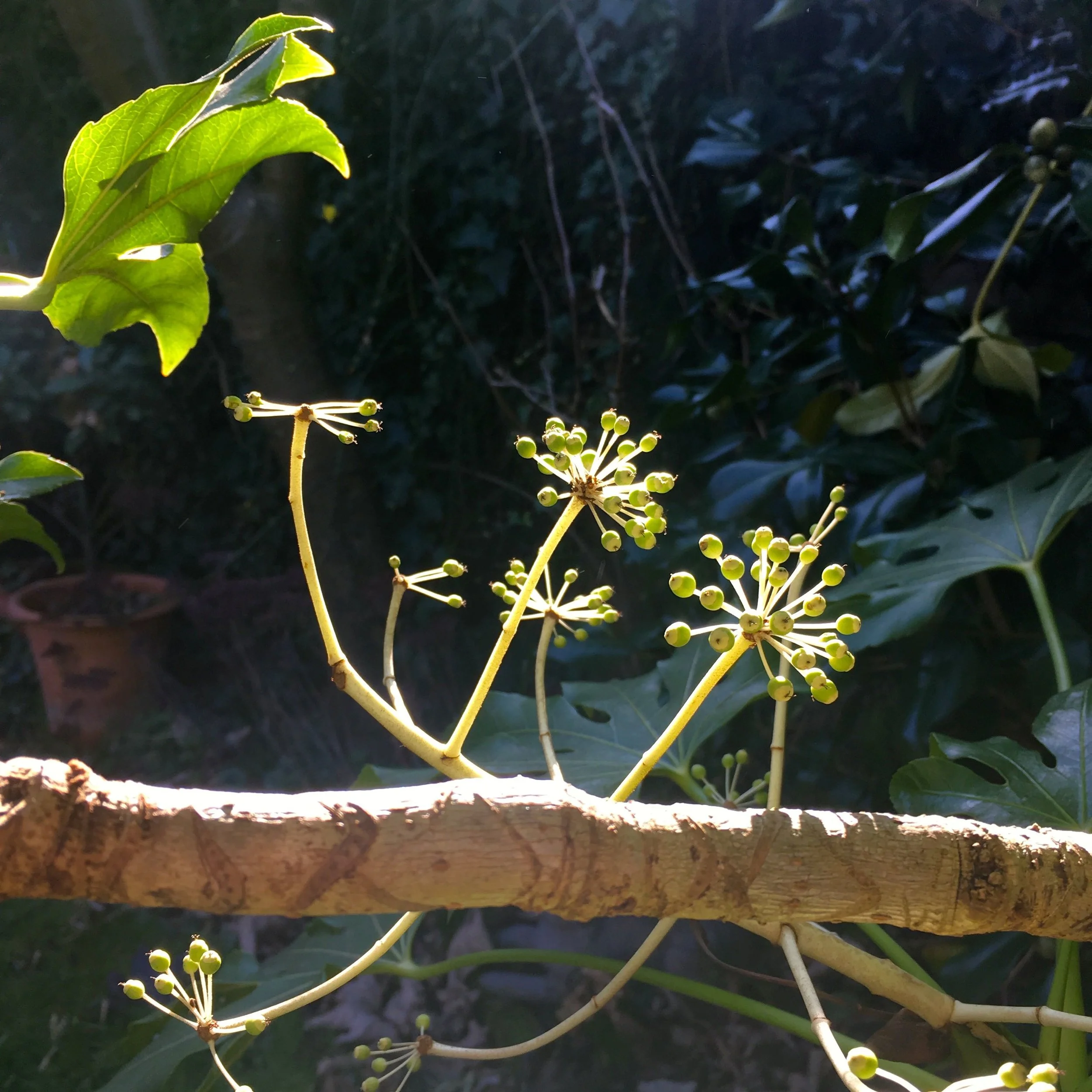 The fatsia flowers are looking particularly sputnik like